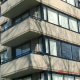 The common 3.5 inch frame and coupling system provides a clean simple transition from window to patio door frame: even around 90 degree corners. Choosing a black exterior frame colour provides a dramatic face lift to the whole building. Aging single glazed aluminum sliders were replaced with heavily thermally broken fixed and operable casement windows to meet current code.
