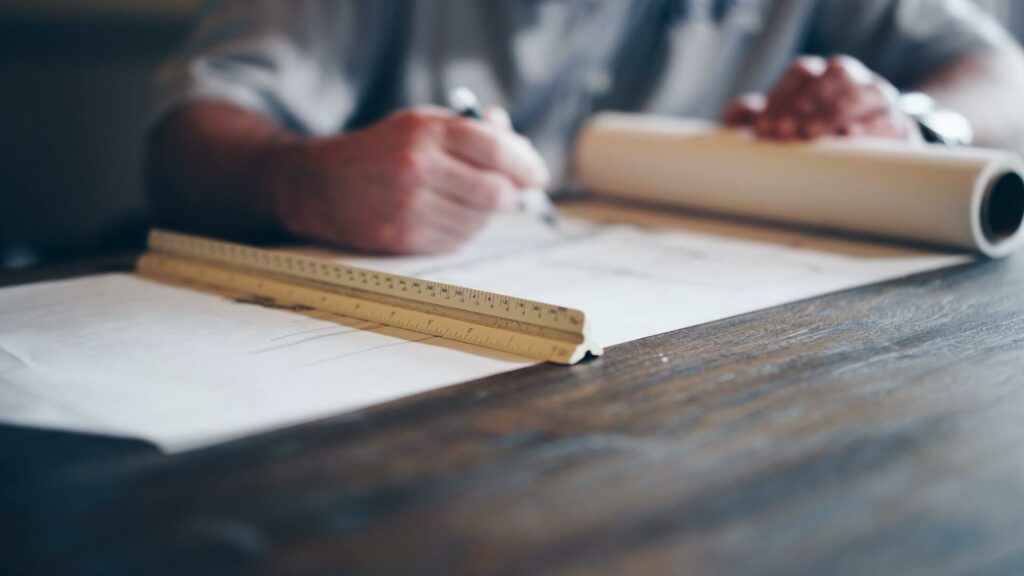 Two people pointing at blueprints on a table. This is supposed to represent a consultation with a contractor.